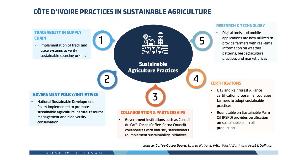 As the world's largest cocoa producer, Ivory Coast has implemented numerous sustainable agricultural practices such as organic farming, agroforestry, efficient water management, and integrated pest management.