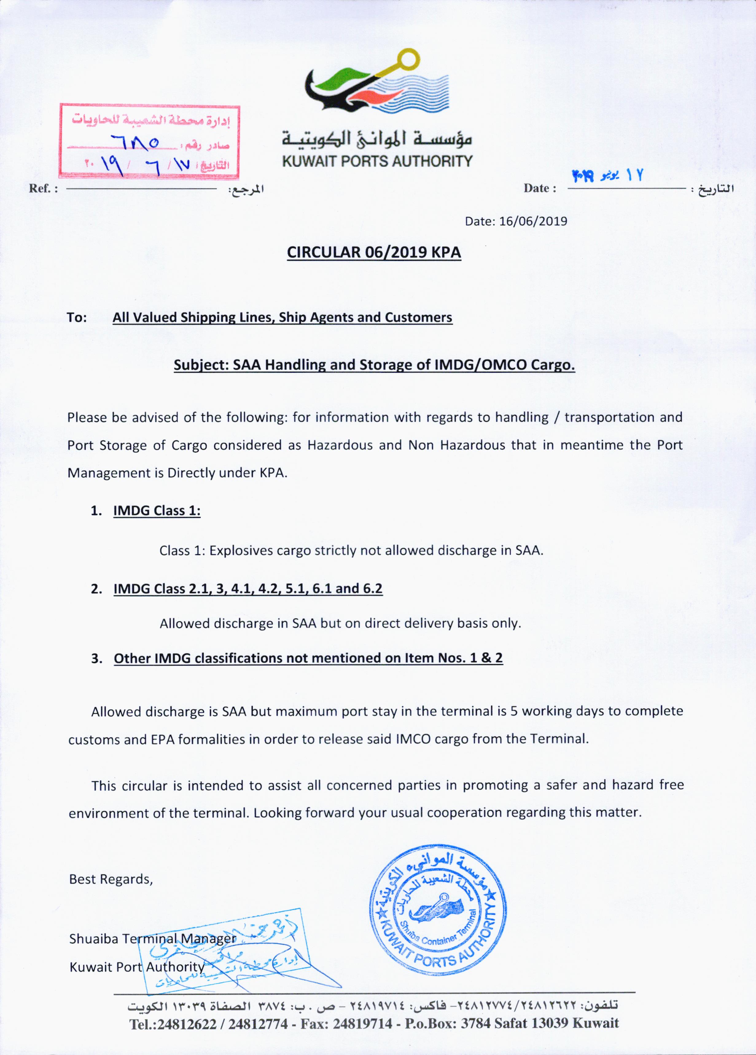 - IMO class 1-7 will not be accepted to Shuaiba. Bookings made to Shuaiba for DG shipments between IMO 1-7 will not be accepted due to port restrictions for discharging the containers. Alternatively, Shuwaikh port can be used for importing this class of IMO containers.