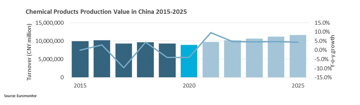 China remained the largest chemical producer globally thanks to a large and growing domestic market. Production value in China is forecast to sustain growth momentum through 2025 thanks to investments in petrochemical infrastructure, aiming to strengthen self-sufficiency.